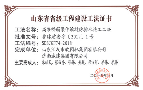 集團(tuán)“高架橋箱梁伸縮縫防排水施工工法”被評為山東省省級工程建設(shè)工法