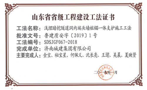 集團(tuán)“淺埋暗挖隧道洞內(nèi)端頭墻樁錨一體支護(hù)施工工法”被評為山東省省級工程建設(shè)工法