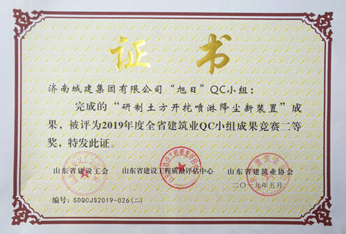 集團(tuán)”旭日“QC小組完成的《研制土方開挖噴漆降塵新裝置》成果被評(píng)為“2019年度全省建筑業(yè)QC小組成果競(jìng)賽二等獎(jiǎng)