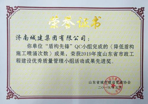 集團(tuán)“盾構(gòu)先鋒”QC小組完成的《降低盾構(gòu)施工噴涌次數(shù)》成果榮獲“2019年度山東省市政工程建設(shè)優(yōu)秀質(zhì)量管理小組活動成果先進(jìn)獎
