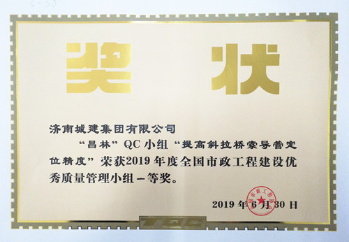 集團(tuán)“昌林”QC小組《提高斜拉橋索導(dǎo)管定位精度》榮獲“2019年度全國市政工程建設(shè)優(yōu)秀質(zhì)量管理小組一等獎(jiǎng)”