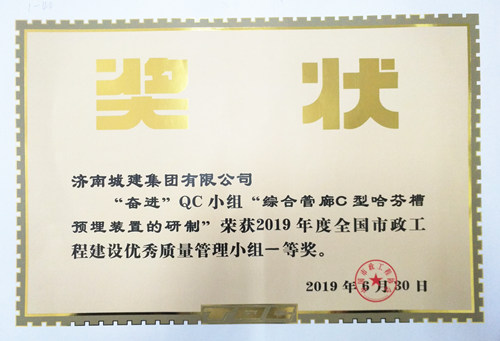 集團(tuán)“奮進(jìn)”QC小《綜合管廊C型哈芬槽預(yù)埋裝置的研制》榮獲“2019年度全國市政工程建設(shè)優(yōu)秀質(zhì)量管理小組一等獎(jiǎng)”