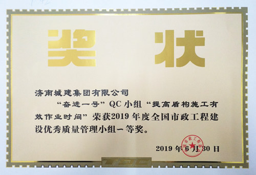 集團(tuán)“奮進(jìn)一號(hào)”QC小組《提高盾構(gòu)施工有效作業(yè)時(shí)間》榮獲“2019年度全國(guó)市政工程建設(shè)優(yōu)秀質(zhì)量管理小組一等獎(jiǎng)”