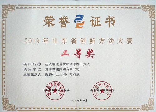 集團《超淺埋隧道拱頂注漿施工方法》榮獲“2019年度山東省創(chuàng)新方法大賽三等獎”