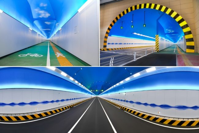 春喧路道路建設(shè)工程全長1620米,其中玉皇山隧道長1150米,單洞斷面寬度19.8米、高度13.6米,快車道11米,行人及非機(jī)動(dòng)車道4米。玉皇山隧道斷面采用左右線分離雙洞形式,每洞設(shè)置中隔墻,將機(jī)動(dòng)車道與人非通道徹底隔離,形成獨(dú)立車行和慢行孔洞,確保行人通行安全。隧道南口設(shè)置聲屏障,有效降低行車噪音對周邊居民小區(qū)、學(xué)校的影響。隧道北洞口采用彩繪施工工藝,與周圍環(huán)境融為一體,整體意境深遠(yuǎn),形成虛實(shí)對比。隧道內(nèi)以“山水泉城”為主題,設(shè)置泉城特色星空頂、藍(lán)天白云噴繪,極大提升整體觀感和行車舒適度。