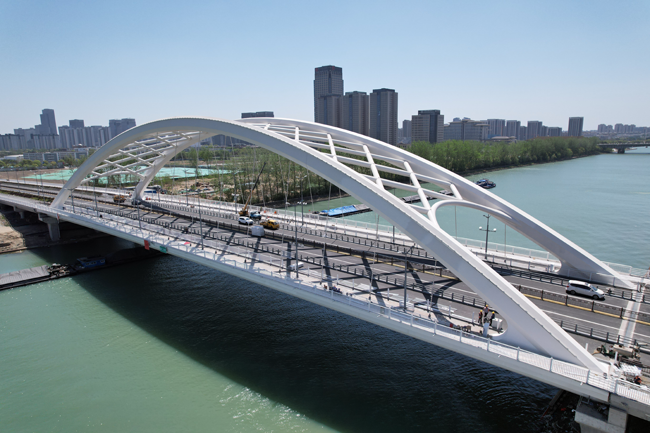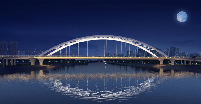 集團(tuán)承建的二里橋路跨京杭運(yùn)河節(jié)點(diǎn)工程(曲江大橋)項(xiàng)目連續(xù)上跨濱河西路、京杭運(yùn)河、東外灘路(規(guī)劃),主橋采用“鋼箱提籃拱”結(jié)構(gòu),由拱肋和交織的橫撐組成,相依相靠,形成穩(wěn)定結(jié)構(gòu)。設(shè)計(jì)靈感源自揚(yáng)州“月亮城”的文化意象。側(cè)觀橋體,兩向內(nèi)收攏的拱肋形如彎月,網(wǎng)狀橫撐交織成輕盈的弧線;夜間燈光亮起時(shí),橋影與水中明月相映成趣,恰似“二分明月落長(zhǎng)河”的詩(shī)意畫卷。橋型勾勒出了古樸靜謐的揚(yáng)州,穿越千年,風(fēng)姿如故,它宜清風(fēng)、宜月色,人與自然相互包容,與揚(yáng)州打造“文化旅游名城、生態(tài)宜居名城” 的規(guī)劃相得益彰。